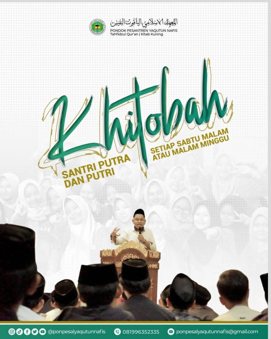 Pondok Pesantren Al Yaqutun Nafis secara konsisten melaksanakan kegiatan Khitobah Santri Putra dan Putri sebagai bagian dari program pembinaan dan pengembangan potensi santri di bidang dakwah. Kegiatan ini merupakan agenda rutin pesantren yang dilaksanakan setiap Sabtu malam atau malam Minggu, dengan melibatkan santri putra dan santri putri sesuai dengan jadwal yang telah ditetapkan.