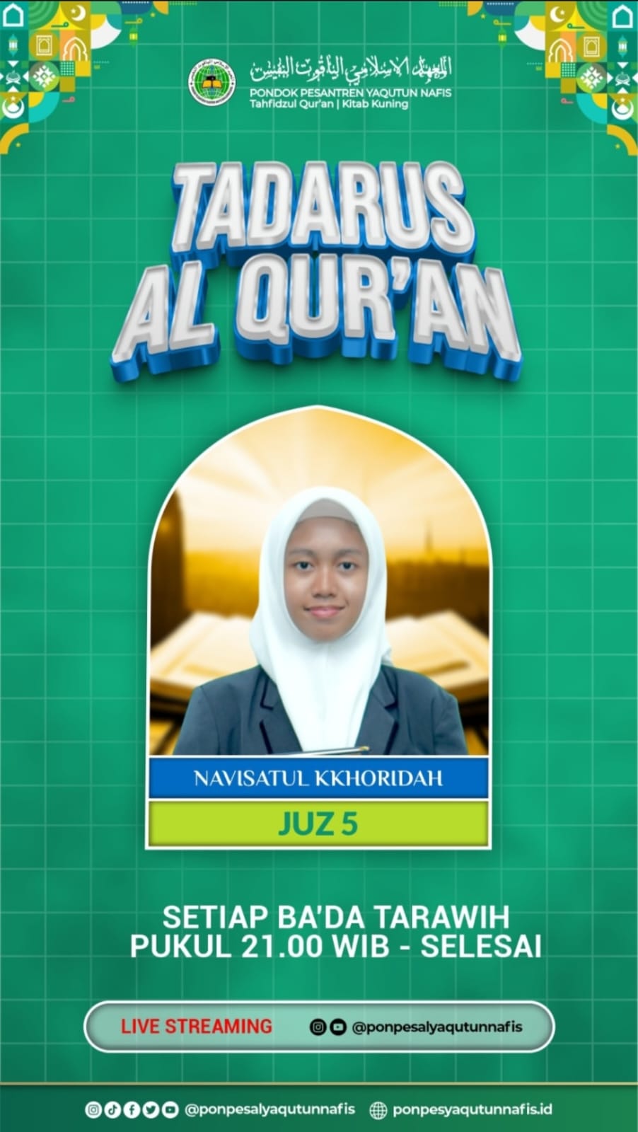 Bagi wali santri dan masyarakat yang ingin menyaksikan Tadarus Juz 5, dapat mengakses melalui media resmi berikut:
